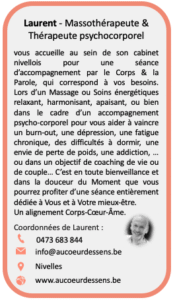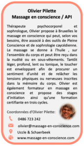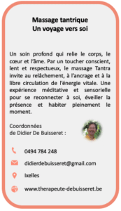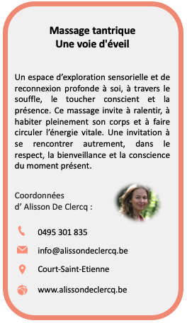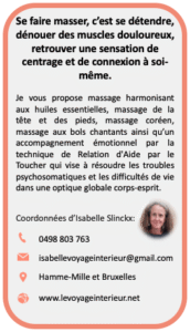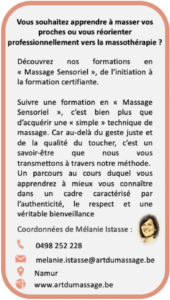 • Le massage est aussi un métier d’avenir, avec des formations accessibles en Belgique. Et pour ceux qui souhaitent aller plus loin, se former est une aventure passionnante : on y développe sa sensibilité, son écoute, son toucher et sa capacité de présence.